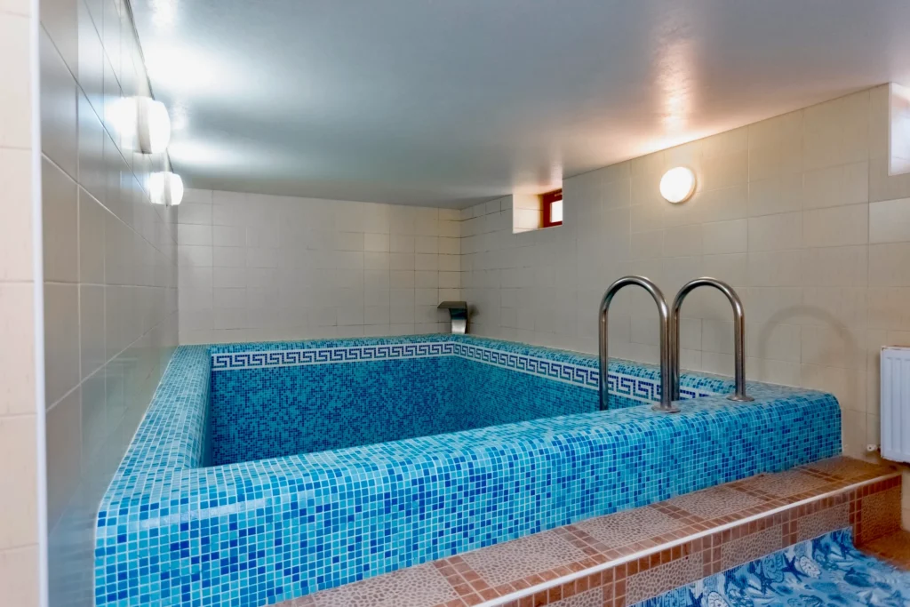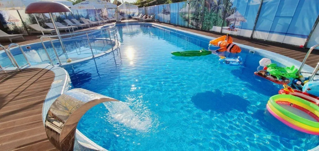 Летом гости могут насладиться просторным бассейном, рассчитанным до 40 человек. Глубина бассейна для взрослых — 160 см, а для детей предусмотрен отдельный, безопасный бассейн глубиной 50 см.