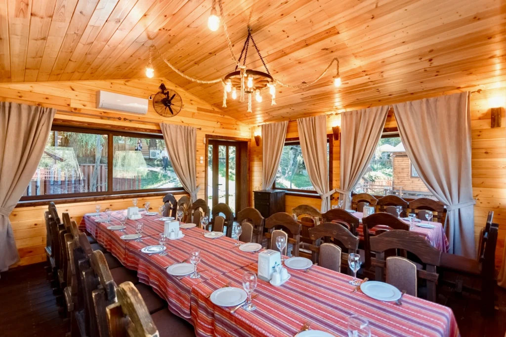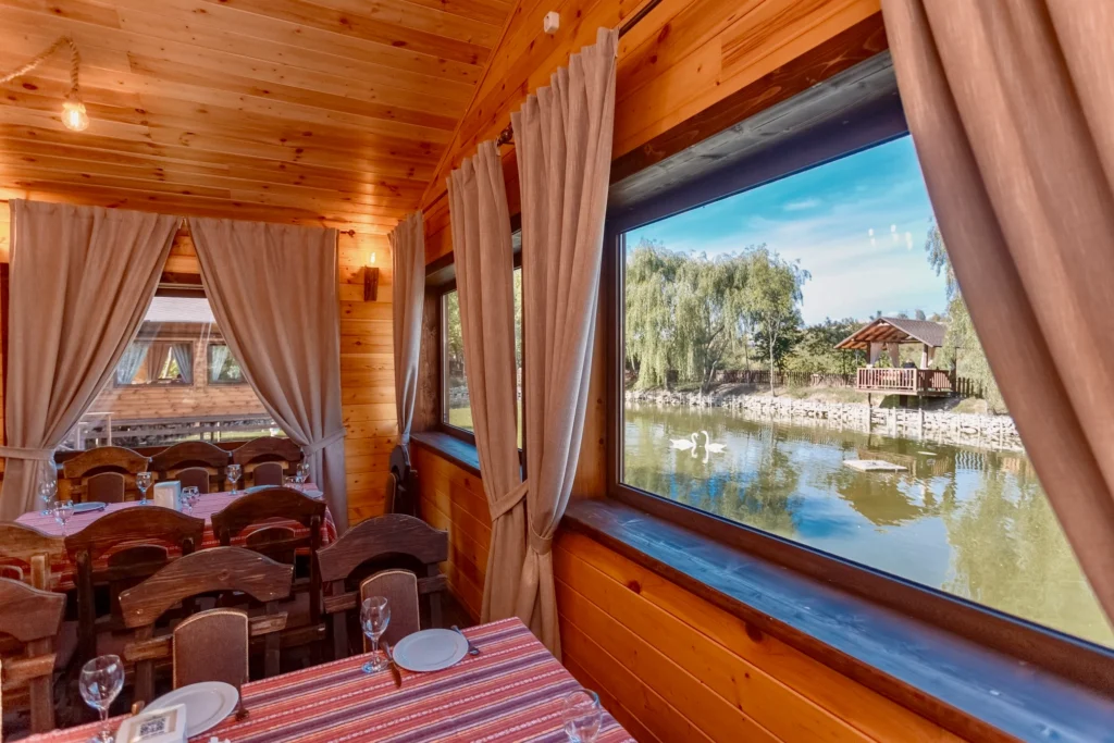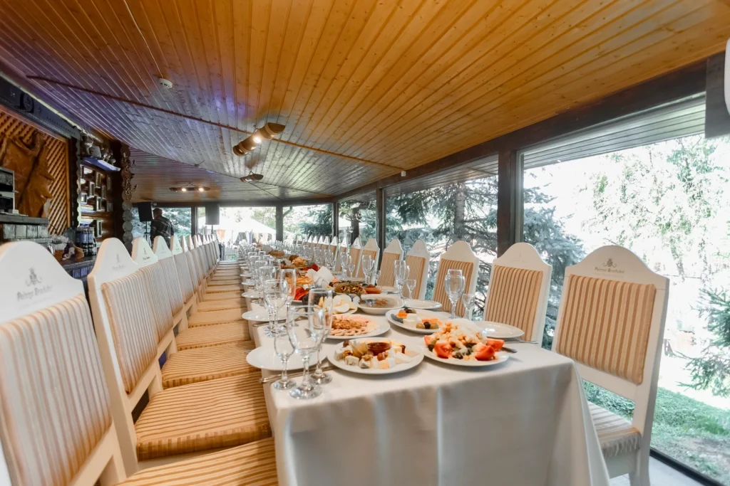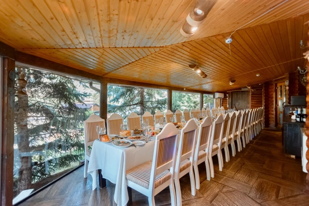 Элегантный и уютный зал с прямым видом на озеро Poiana Bradului. Подходит для небольших мероприятий: юбилеев, корпоративных вечеринок или приватных встреч. Естественное освещение и интерьер из дерева создают гармоничную и тёплую атмосферу.