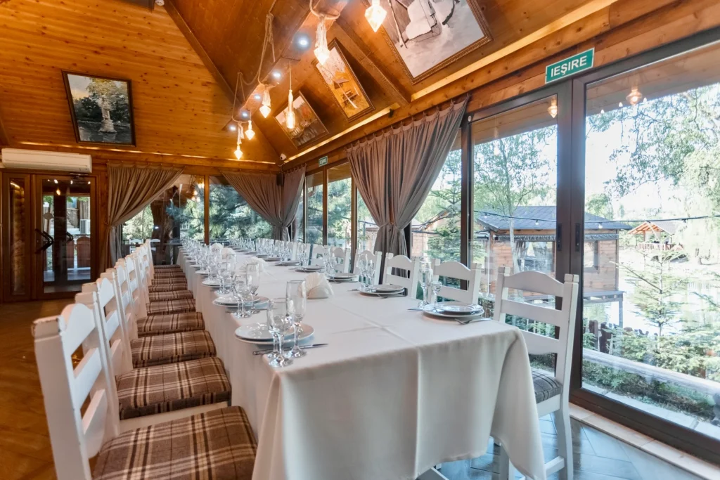 Зал на Озере — это место, где природа встречается с изысканностью. Пространство идеально подходит для мероприятий до 40 гостей. Панорамные окна открывают захватывающий вид на озеро Poiana Bradului, создавая живописный фон для любого торжества.