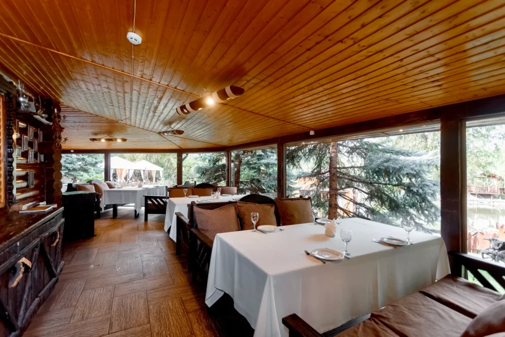 Веранда — светлый зал с панорамными окнами, выходящими прямо на озеро. Тёплая атмосфера дерева и естественного освещения превращает его в идеальное место для особых моментов. Вместимость до 30 гостей позволяет проводить праздники, корпоративы, юбилеи, семейные ужины или частные встречи.